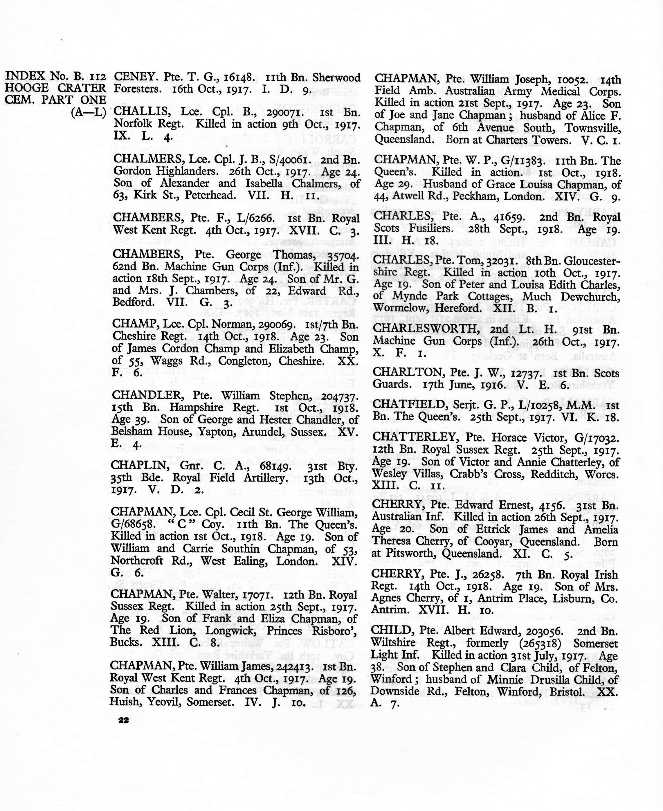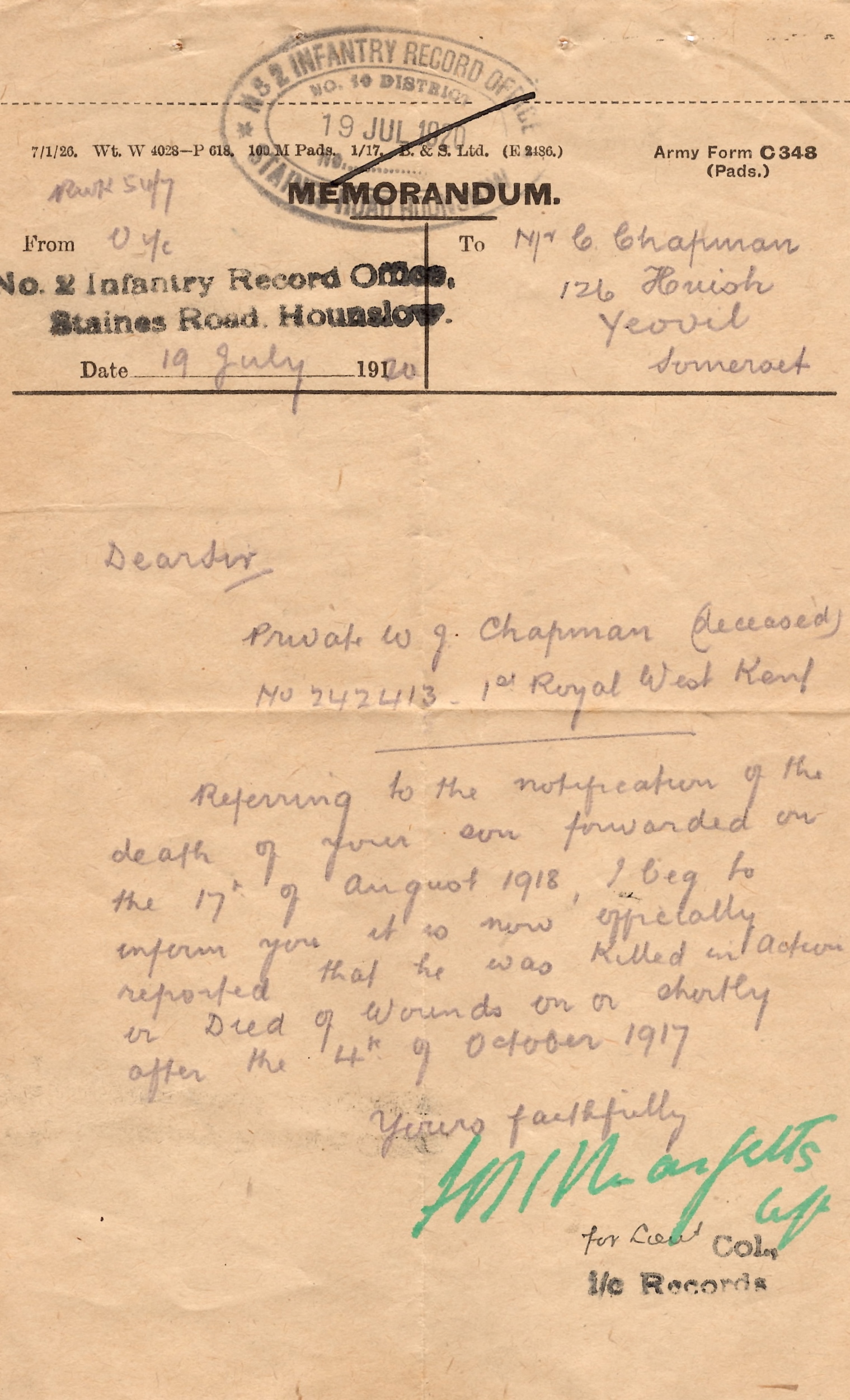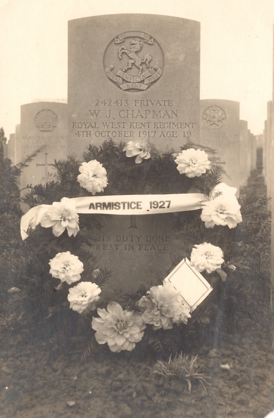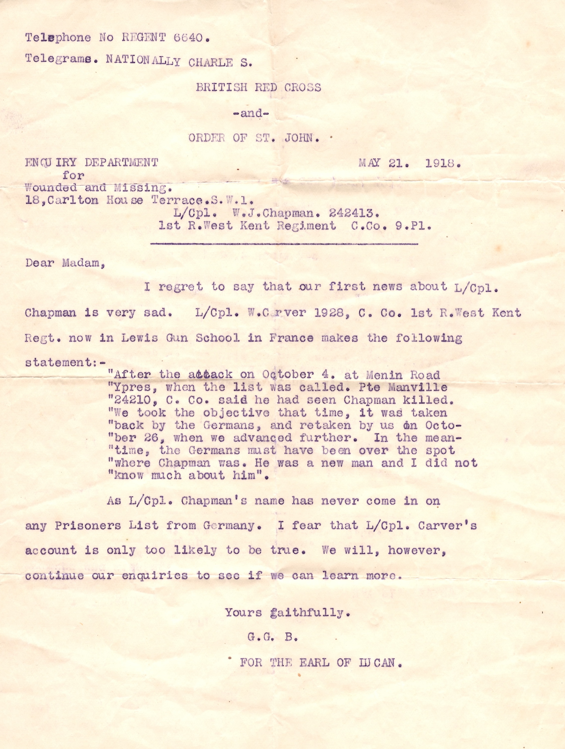 “After the attack on October 4 at Menin Road Ypres, when the list was called Pte Manville 24210, C. Co. said he had seen Chapman killed. We took the objective that time, it was taken back by the Germans, and retaken by us on October 26, when we advanced further. In the meantime, the Germans have been over the spot where Chapman was. He was a new man and I did not know much about him”