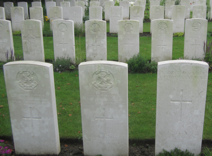 I took the following shot on purpose to include the graves on either side of his. To the right as we see it below is ‘A SCOTTISH SOLDIER OF THE GREAT WAR – KNOWN UNTO GOD’. That kind of anonymous grave was quite common, if not the majority of those there, and I wanted to ask how they knew his nationality but not his identity. But then I didn’t want to ask too hard, for fear of how that might have come to be.