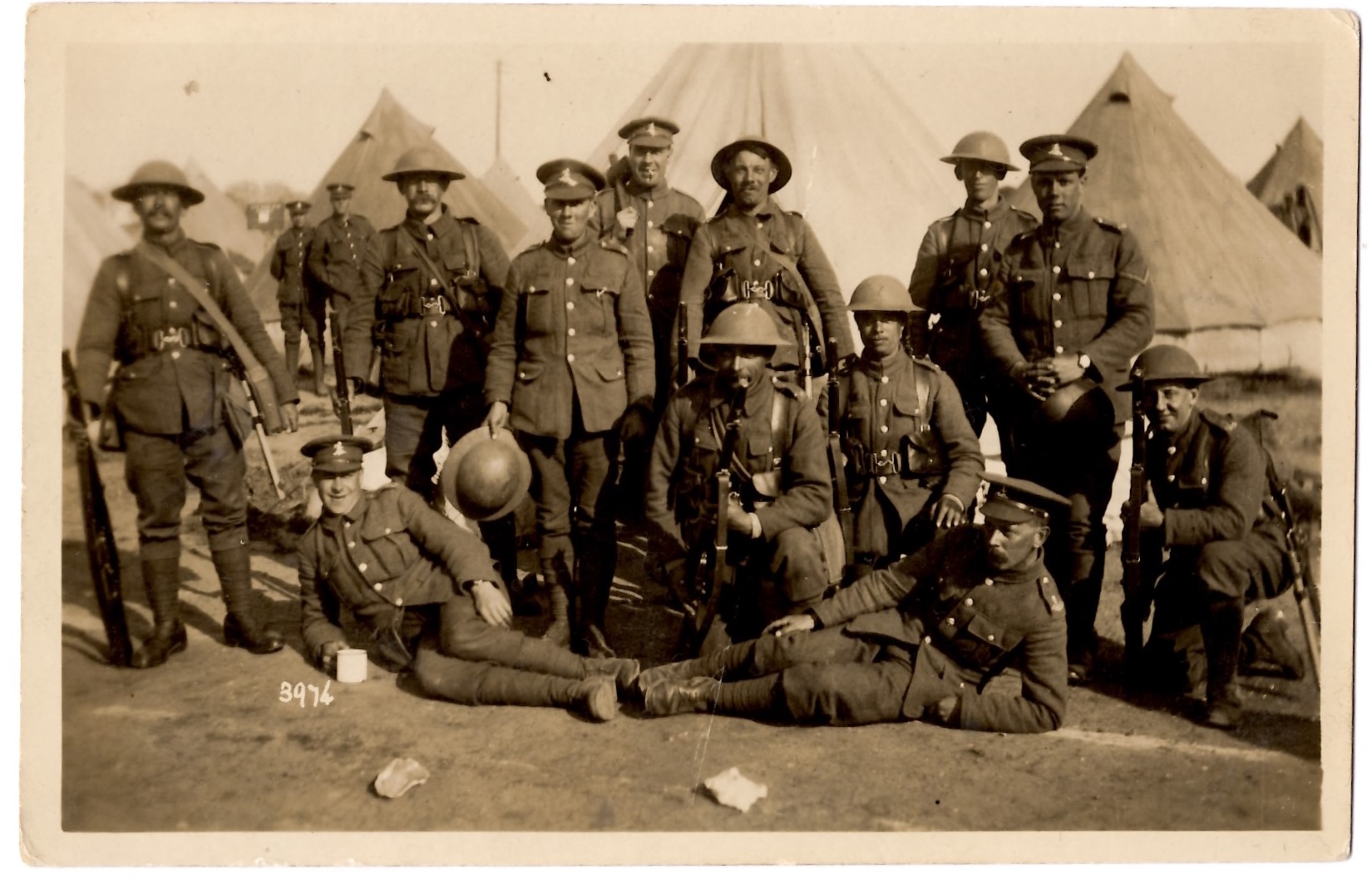 It shows Billy and his comrades. From when? It looks possibly like it’s from the front. But maybe not. There are no trenches in sight and they look in good spirits. So was it maybe in Kent or in France, on the way? But there are tents and more than half the men are wearing the recognisable Tommy helmet (to give the item just one of its nicknames). I feel like they could have easily been going in to battle soon. Who would survive? How did such a photo come to rest in my hands? I’ll never know about its first years.
