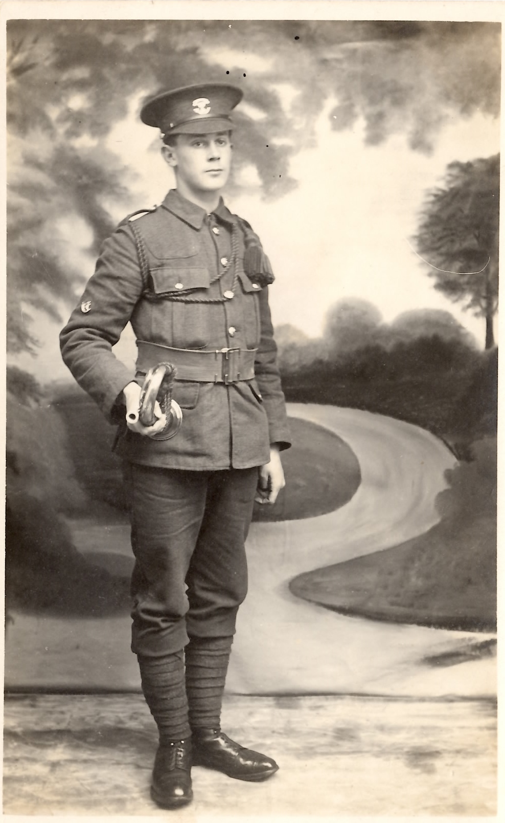 The first one has a twee country lane backdrop. It was printed as a postcard, which was very common back then, and has nothing on the reverse. Perhaps, historically, someone would be able to look at what he’s wearing and confirm whether he was indeed a grenadier, as gran used to tell me, with all the extra danger that entailed. Or does the bugle he’s holding tell us something else? I can’t tell. Not yet, anyway.